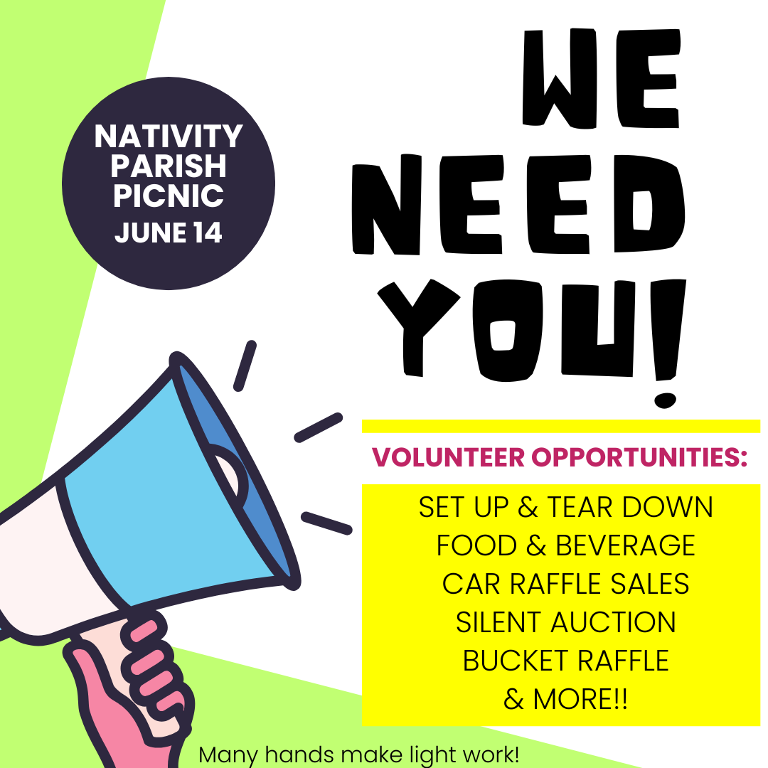 As in any family, our parish has needs. We have the need to learn about God and one another, the need for help inside and beyond the walls of the parish and also the needs met by supporting day-to-day operations of our ministry. What you find below are just the basics of the needs and opportunities available in our community - we encourage you to reach out to a staff member at the office to learn more about how your unique gifts and schedule can help meet the needs of this family of disciples.