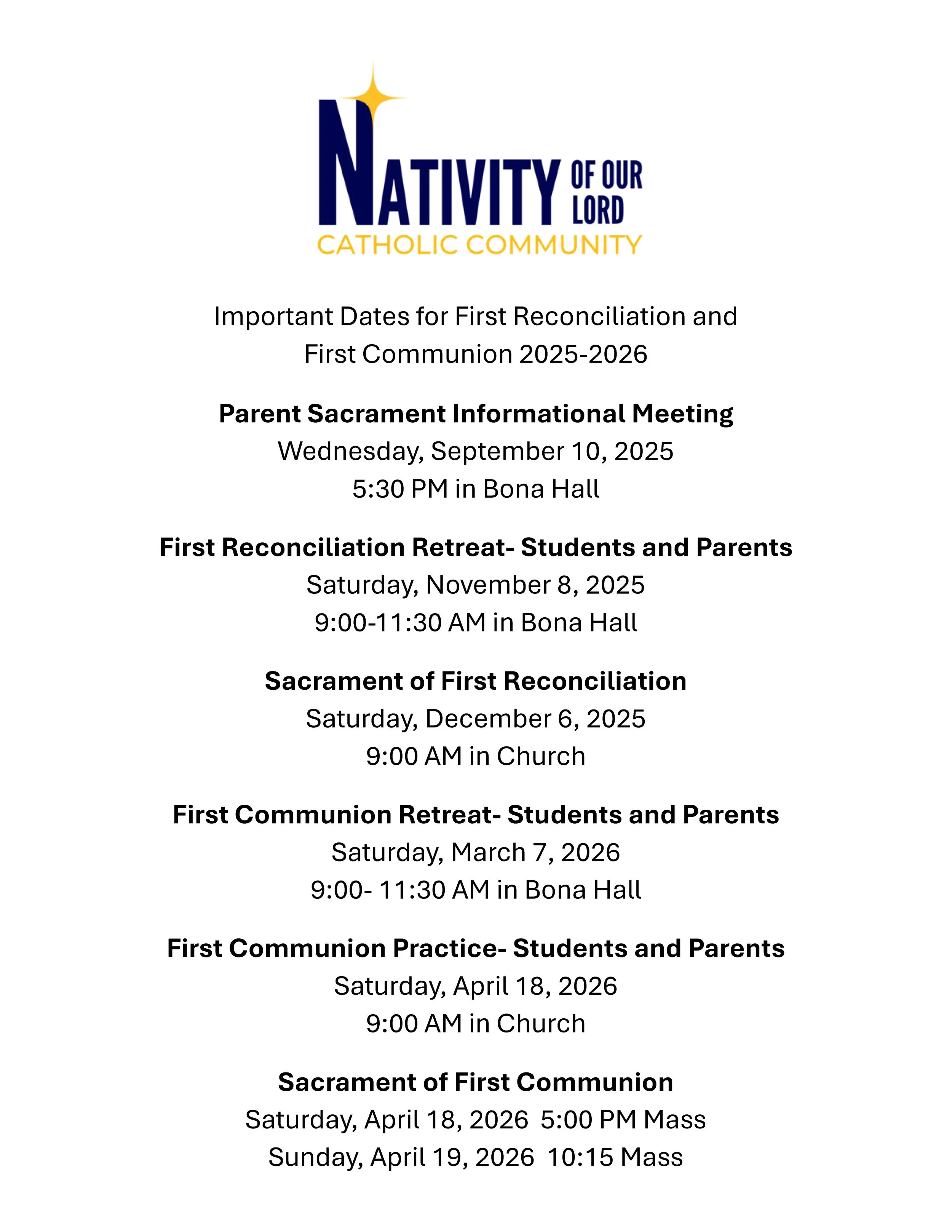 2025-2026 Important Dates for First Reconciliation and First Communion Prep